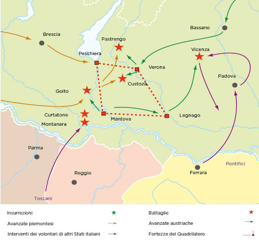 I Piemontesi, dunque, si preparano a invadere il Lombardo-Veneto dietro Radetzky, il quale fugge in direzione del Quadrilatero, un sistema di quattro fortezze,Legnago, Peschiera, Mantova e Verona, messo in piedi dagli Austriaci e che rappresentava una zona strategica, poiche' a Nord era protetta dal lago di Garda, a Sud era protetta dal Po e a Est si trovava la valle d'Adige che metteva in comunicazione.